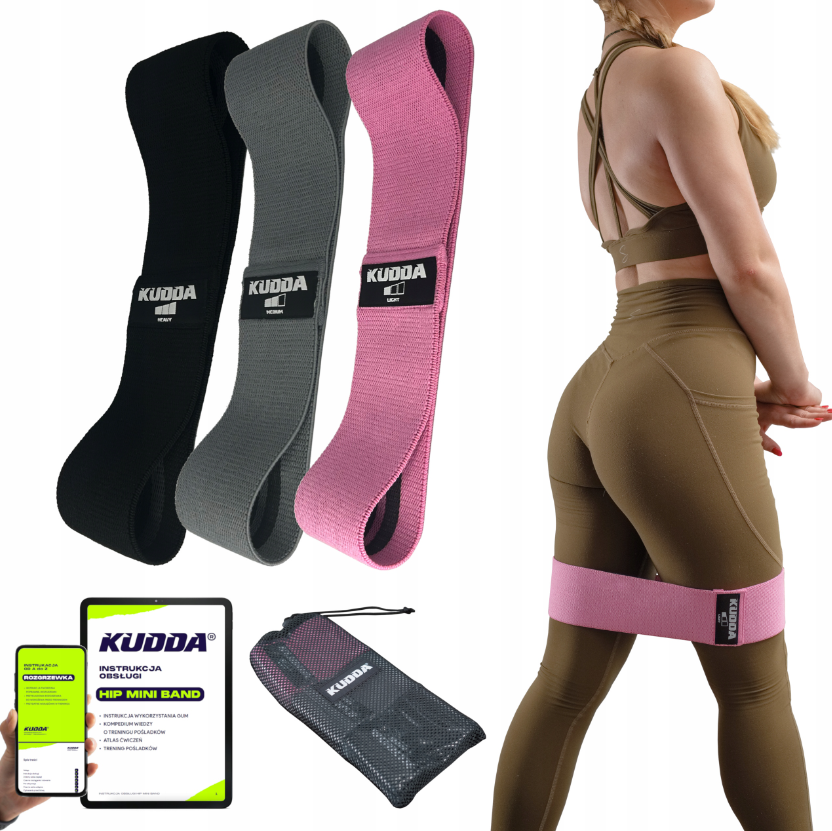 Gumy do ćwiczeń KUDDA HIP MINI BANDS wraz z kompletną instrukcją wykonywania ćwiczeń i przykładowymi planami treningowymi na POŚLADKI do zastosowania w każdej chwili!